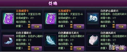 天堂圣羽不仅仅能让玩家翱翔天际,甚至能利用天堂圣羽来获取无上威望!玩家在游戏“兑换”界面中的新增物品兑换中,使用天堂圣羽可以兑换10w威望,而使用时装升阶材料可以互相兑换其他时装升阶材料。