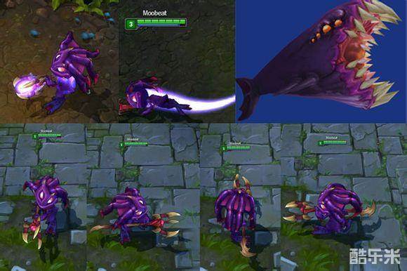 首先也是外观的改变,变成虚空风格(还长了三只眼睛),武器变成一个爪子,而且是活的,E技能跳起和原地落下有较明显特效,Q技能有较明显特效,R技能召唤一只虚空怪鱼,回城也有特效。全新音效动作,鲨鱼像一个全是尖牙的食人花,上面背景也说了。