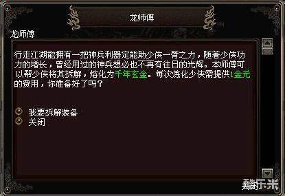 1、在NPC龙师傅处,选择装备拆解,并放入你要拆解的王陵、极乐洞、狐狸洞系列的任意装备,系统将提示您可拆解成的千年玄金数量。