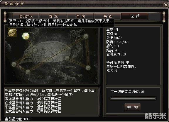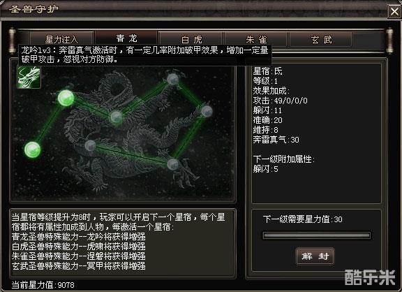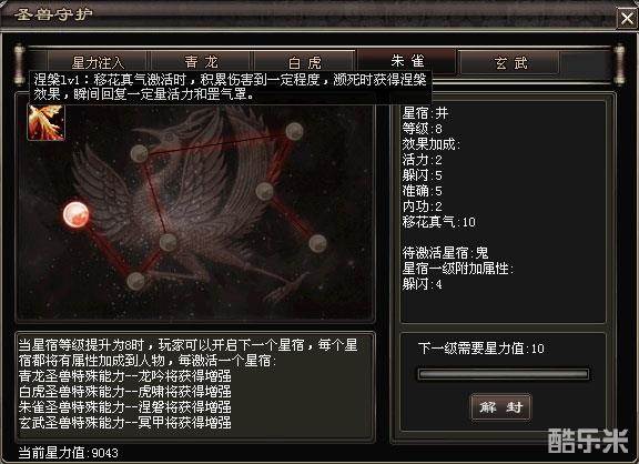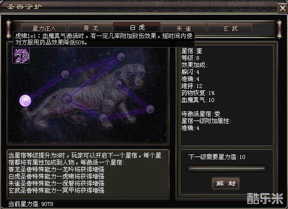1.增加星力值2.消耗星力值解封星宿,获得对应的星宿加成属性。 3.提升星宿等级提升能力。星宿数量越多,数量越高,能力加成属性越强 4.当对应圣兽的星宿等级到达8级时候,将自动激活特殊技能