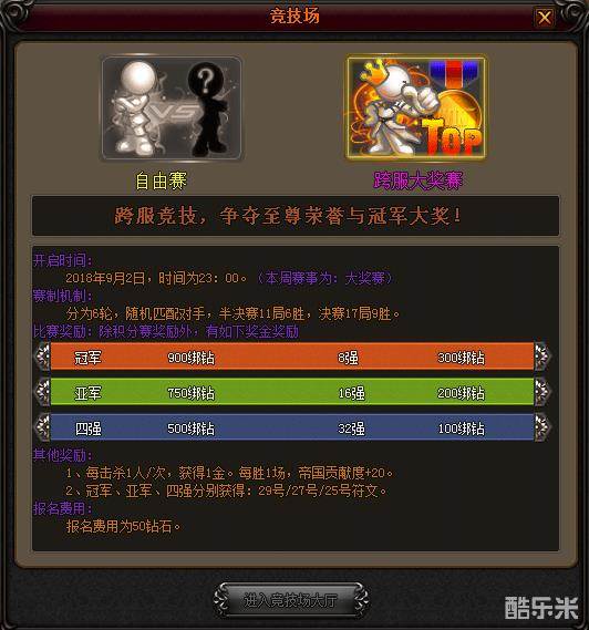 大奖赛需要比赛当天提前报名,最多可以同时报名64人,每场比赛开始都将淘汰一半,直到产生冠军。从32强开始,胜利即可获得大量绑钻奖励,冠军、亚军、季军还可以获得高级神符。并且,在每场战斗中,还可以获得帝国贡献和金钱奖励。
