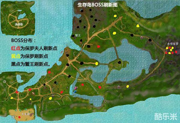 生存岛boss共计4只,水怪保罗、保罗夫人和两只蟹王,随机分布于岛内各处,出生在保罗巢穴和蟹王巢穴的几率更高,击杀后将可能获得稀有传奇装备和更多高级宝物,如高级精炼宝石、名人刻刀、五级宝石,甚至传奇装备“蓝色獠牙”,高级符文掉落更是远远高于精英怪物。抢夺Boss可并不那么容易,狼多肉少,高风险高收益~~