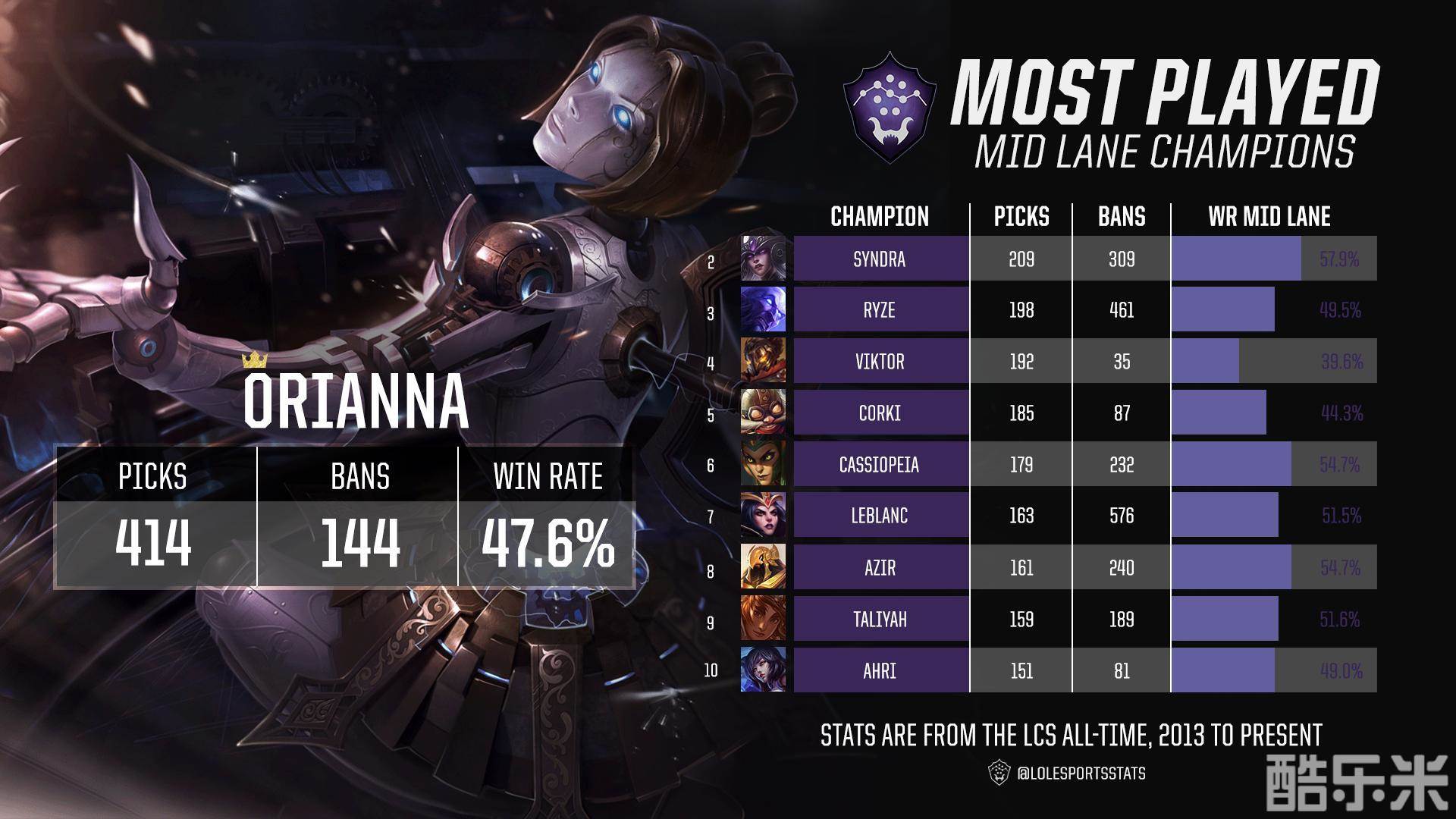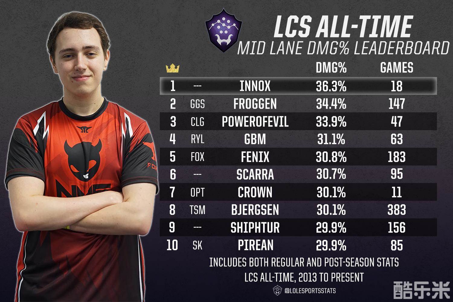 今日,LCS赛区的数据LoLEsports Stats发布了一系列的北美LCS赛区历史上中单位置的各项数据情况,包括击杀数榜单、KDA排名、分均伤害排名等。北美的中单经过这么多年的更新迭代,涌现了不少优秀的中单选手,他们都为赛区和战队的进步做出了一定的贡献。
