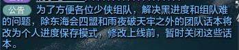 为了方便各位少侠组队,解决黑进度和组队难度的问题,除东海会四盟和雨夜破天牢之外的团队话本,将改为个人进度保存模式,修改上线前,暂时关闭这些话本。