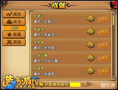 在成就系统当中,我们可以看到成长、关卡、战斗、收集、竞技五种分类,每种分类里都包含了对应的成就要求。只要你达成了成就要求就会在成就后面显示“已完成”,并且获得对应的成就点。