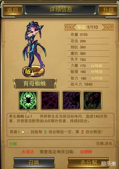 刀塔女神育母蜘蛛是敏捷英雄,初级附带技能是寄生蜘蛛。刀塔女神育母蜘蛛初始技能寄生蜘蛛属性是将卵寄生在当前目标体内,造成140点伤害,并使普攻附带20.0点额外伤害,持续2回合。