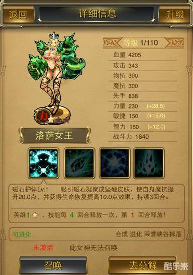 刀塔女神洛萨女王是力量英雄,初级附带技能是磁石护体。刀塔女神洛萨女王初始技能磁石护体属性是吸引磁石凝聚成坚硬皮肤,使自身魔抗提升20.0点,并获得生命恢复提高10.0点效果,持续3回合。