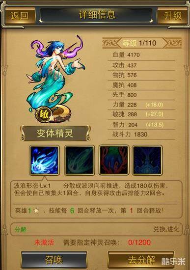 碧浪形态属性:分散成波浪向前推进,造成180点伤害,但会使自己被集火1回合,自身获得攻击后排能力2回合
