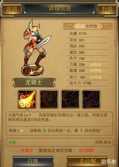 火焰气息属性:向面前锥形范围内吐出一道火焰,对敌方前看、两排单位造成170点伤害。