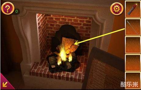 3、拿到蜡烛和铁棒后,点击壁炉,利用壁炉内的火焰把蜡烛点着。然后壁炉内有桌子上圆盘的一部分,用铁棒将其勾出来。