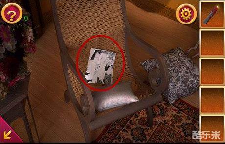 7、此时点击房间里的椅子,如图所指的位置,将椅子上的枕头移开,可以拿到一张破碎的画。