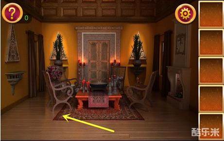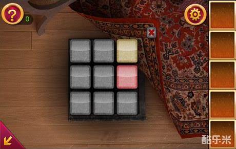 9、此时掀开地上的地毯,在地毯上可以看到一个密码器,先点击图中红色方框那个按钮,接下去每点击一个按钮下一个按钮就会发光(例如先点击红色,黄色格子发光,此时再点击黄色,另一个颜色又会发光,以此类推),按照顺序依次点过去即可,打开密码器就可以拿到钥匙的另一部分。