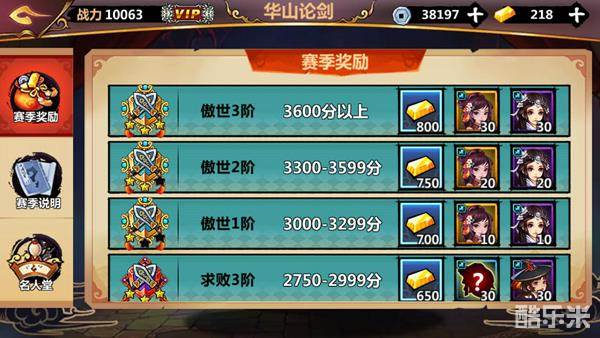 华山论剑不止能验证你的实力,而且奖励多多哦!每日参与一定的场次,可以获得对应的金砖和铜钱奖励;每周获得一定的胜场,可以获得对应的金砖和随机侠客碎片。最后,还有一个重头戏,赛季奖励!
