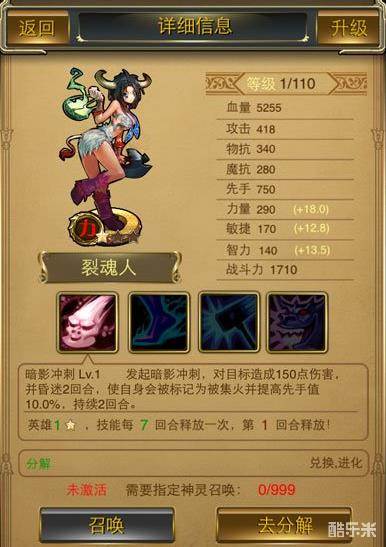 刀塔女神裂魂人是力量英雄,初级附带技能是暗影冲刺。刀塔女神裂魂人初始技能暗影冲刺属性是发起暗影冲刺,对目标造成150点伤害,并昏迷2回合,使自身会被标记为被集火并提高先手值10.0%,持续2回合。