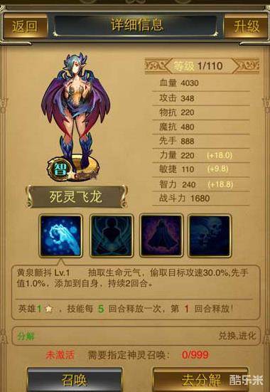 刀塔女神死灵飞龙是智力英雄,初级附带技能是黄泉颤抖。刀塔女神死灵飞龙初始技能黄泉颤抖属性是抽取生命元气,偷取目标攻速30.0%,先手值1.0%,添加到自身,持续2回合。