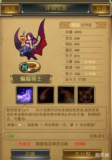 刀塔女神蝙蝠骑士是智力英雄,初级附带技能黏性燃油。刀塔女神蝙蝠骑士初始技能黏性燃油属性是向小范围内目标泼洒黏性燃油, 使其受攻击时承受额外20.0点伤害效果并降低3.0%先手值,持续5回合,可叠加。