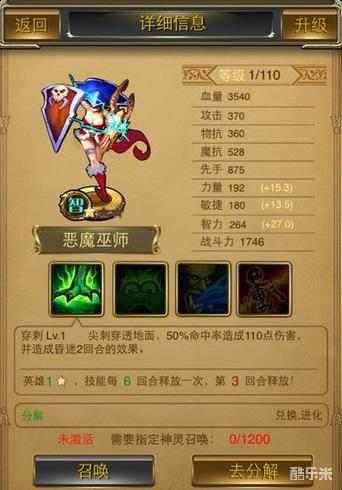 刀塔女神恶魔巫师是智力英雄,初级附带技能是穿刺。刀塔女神恶魔巫师初始技能穿刺属性是尖刺穿透地面,50%命中率造成110点伤害,并造成昏迷2回合的效果。