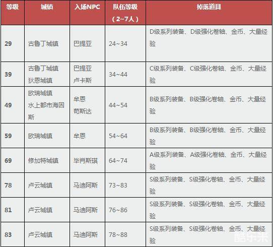 深渊迷宫的入场NPC为每个城镇的看守欲界的“警卫队长”,深渊迷宫的等级繁多,从29级开始直至83级,具体的资料如下表所示: