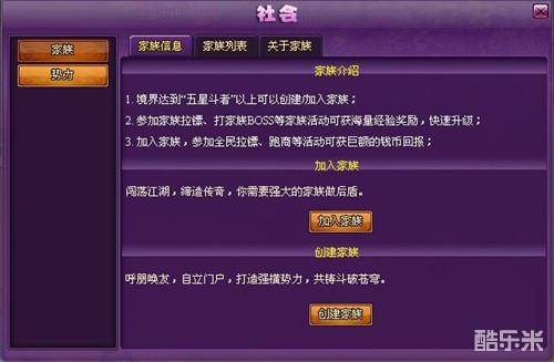 当然,如果你觉得自己还不够实力来称老大,也可以选择一个自己心仪的家族加入,这样在强者的领导下,相信你在游戏中的实力,也会很快增长的。这时,你只需要申请加入,就等待家族族长的审批之后,就可以加入家族了。在加入家族之后,你可以参加家族BOSS战,与兄弟们一起去打BOSS,家族齐来打BOSS掉落的奖品很珍贵,所以一定要把握住。这也是一次考验你们团队合作的极好机会。