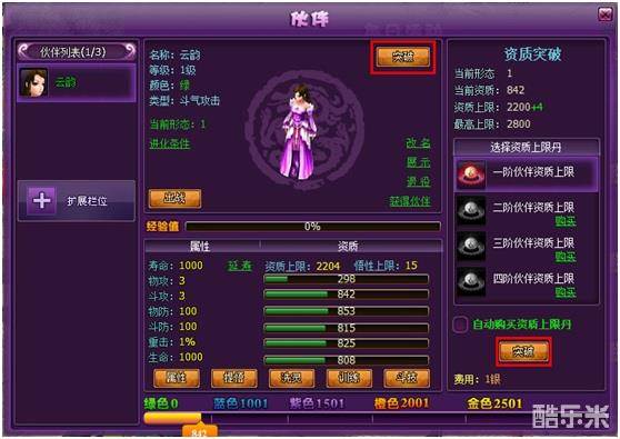 .新增伙伴突破功能,在伙伴界面点击打开【突破界面】,使用资质丹,可以针对不同形态的伙伴提高其资质的上限