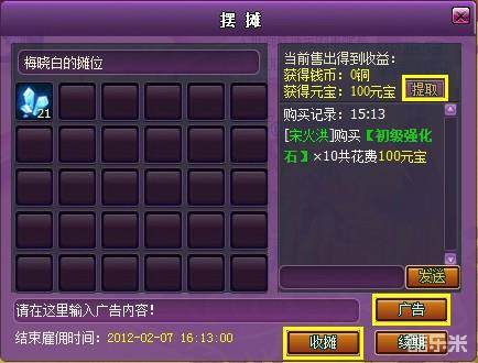 如果你在竞游网《斗破苍穹2》中畅玩的时候,手头有闲置的物品或者急需某样物品的时候,都可以到竞游网《斗破苍穹2》帝都摆摊出售或购买自己需要的物品。来到帝都的摆摊区,点击背包里的『摆摊』按钮就会弹出摆摊界面。把你想要出售的物品拖放在摆摊界面。然后输入你想出售的物品单价以及摊位名称,确定后选择要雇佣小浣熊摆摊多少小时,再点击摆摊界面的『摆摊』即可进行摆摊了。当然,摆摊是要收取一定的费用的,每出售一件商品系统会收取3%的交易税。