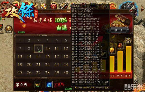 出门在外,师傅交代,少花钱,花好钱,玩《攻铩》,首先就要下血本!什么血本?舍得5W元宝,才能空手套白狼!哥们网《攻铩》投资计划大爆料,你首先要舍得包裹里的5W充值元宝,才能随着时间的推移,在30天内分批取回本金,还能赚到大笔稀有道具!是的,你没有听错,本金5W全部取回一分不花!