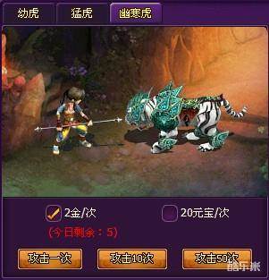 8090斗破苍穹2中猎宝谷中的老虎分为幼虎、猛虎、还有一种最凶猛的幽寒虎,每次击杀老虎都要消耗一定的金钱或是元宝,千万别小看这些老虎,人家也是有档次之分的,每次攻击幼虎仅需要50银币或者6元宝,每次攻击猛虎需要1个金币或者12元宝,而档次最高的幽寒虎则需要2个金币或者20元宝。但是老虎档次不同,宝贝又有何种差别呢?