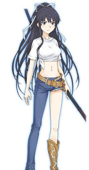拥有自由操控其腰间令刀“七天七刀”的卓越剑术、最擅长配合魔法的肉体强化的白兵战。束成马尾的黑色长发垂至腰际、身材高窕皮肤白皙的美女。