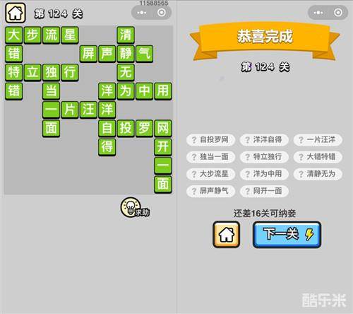 《成语升官记》举人第124关涉及到了11个成语,其中部分成语虽然不是什么生疏的成语,但是对于部分网友来说还是比较难一下子就能根据汉字推断出成语的,下面是小编为大家准备的答案!