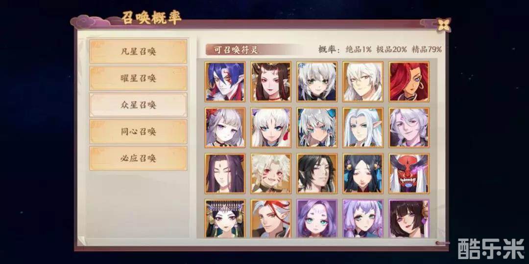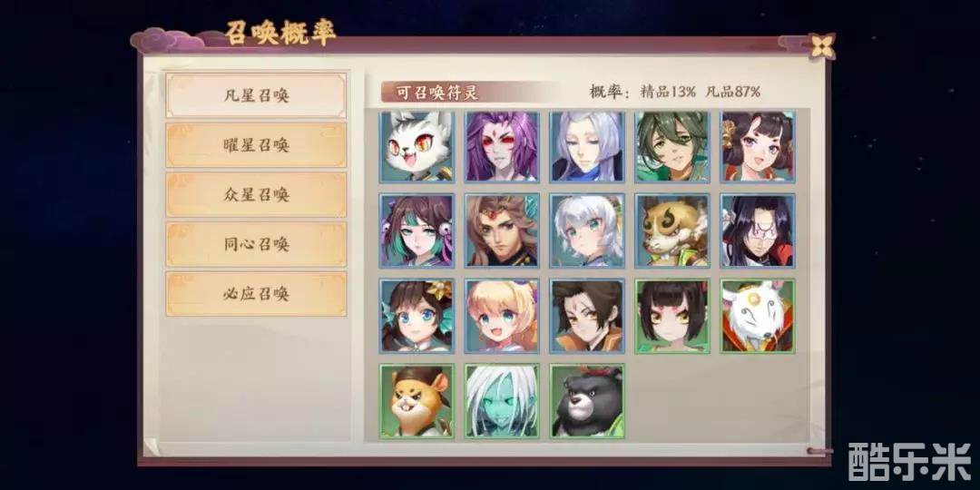 凡星召唤即最普通的单人抽卡模式,可召唤出凡品至精品的全部符灵,每次仅需消耗一颗普通星曜。
