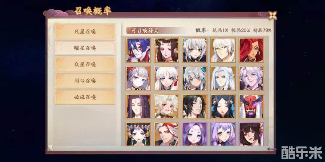曜星召唤:消耗1颗星曜进行单抽,有机会获得精品、极品、绝品符灵;