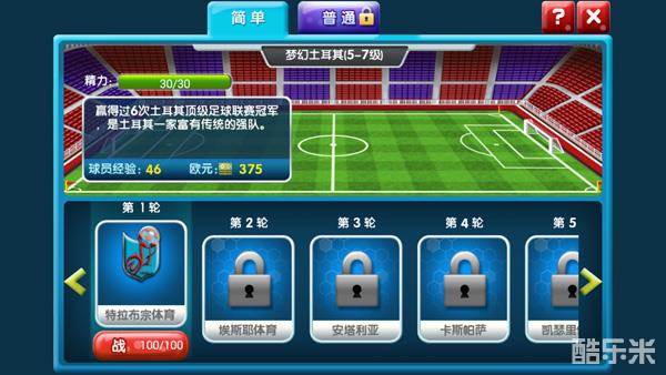 游戏中,副本的难度分为简单、普通、困难3个等级,挑战难度将依次增加;每个小关卡挑战通关后,即可获得欧元及其它游戏内道具奖励,同时还将获得一定的球员经验;当挑战球队获胜且评为3星时,则会获得球员经验奖励翻倍;