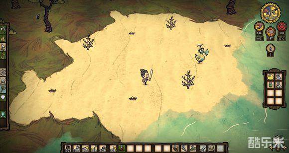 每张图只有两只,在特定的位置地形出现,沙滩上有4草3树枝,如下图: