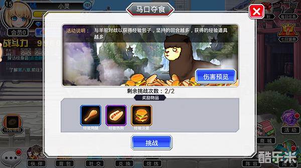 点击下方的“挑战”按钮,即可进入马口夺食战斗!从羊驼犀利的大龅牙完全可以看出,这只羊驼有多嚣张,多难缠!事实也是如此,因为他会释放单体秒杀技(技能名称叫喷一下、喷二下、喷三下……)!小编被喷了3下就全体扑街!