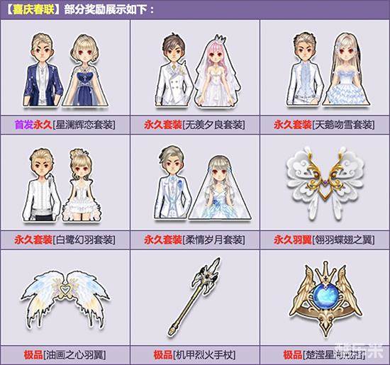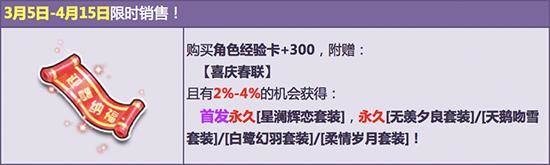 3月5日-4月15日,在飞车商城购买【角色经验卡+300】,赠送【喜庆春联】,有机会获得首发永久【星澜辉恋套装】、永久【无羡夕良套装】/【天鹅吻雪套装】/【白鹭幻羽套装】/【柔情岁月套装】或其他奖励之一!其中核心极品期限型概率范围为:4%-6%,核心奖励永久型概率范围为:2%-4%,非核心奖励概率范围为:90%-94%。