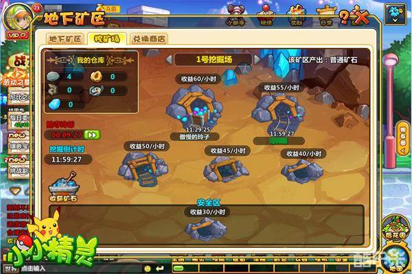 萌乐网《小小精灵》中,,玩家通过主线剧情开启地下矿区后,可以进入挖矿场进行矿石挖掘。玩家通关的地下矿区越多,挖矿场开启数量越多,可以获得的矿石种类也越多。挖矿场中有安全区与非安全区之分,非安全区收益较高,但是容易被其他玩家抢夺,所以一定要根据自己的实力去占领适合自己的挖掘场哦!