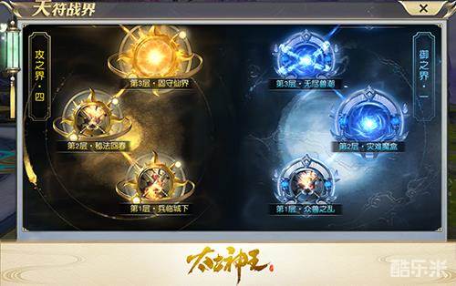 “天符战界”分为狂攻之界和御守之界两界,即天符战界·攻和天符战界·御,分别用考验修仙者的攻击能力和防御能力。攻之界中的敌方具有强大的防御能力,需要具备强大的攻击能力才能通关;御之界中的地方具有强大的攻击能力,需要具备强大的防御能力才能通关。