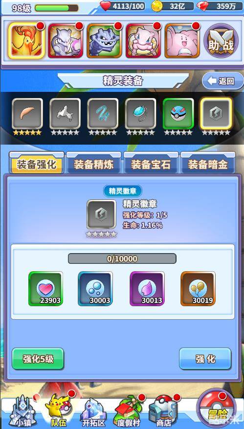 如图上所示,精灵装备解锁后总共有四个养成方法分别是装备强化、装备精炼、装备宝石和装备暗金,每个养成功能的道具都可以通过度假村的果树园种植、游乐场等玩法中获得。
