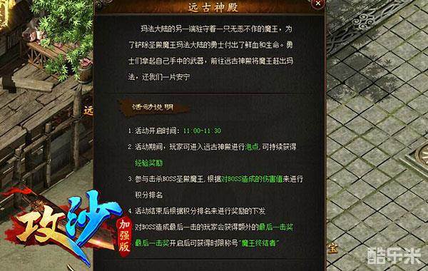 1、远古神殿活动开启3分钟后,将刷新圣殿魔王。系统根据玩家们对魔王造成的攻击伤害排名,截止活动结束时,伤害排行榜排名越前的玩家,获得奖励越多。