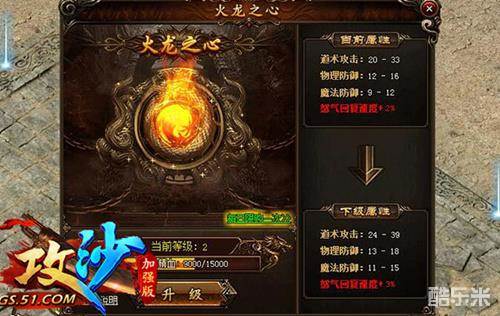 1、英雄合击技能威力与火龙之力紧密相关,每个英雄都标配一个火龙之心。火龙之力可为英雄带来攻击、物理和魔法防御,以及怒气回复速度。
