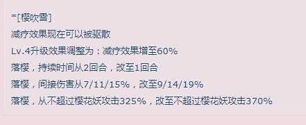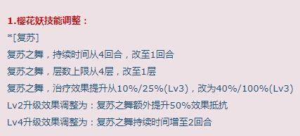 复苏之舞的持续时间即治疗量增加的效果,从4回合降低至两回合,层数上限变为一层,对应的是一旦释放二技能,樱花妖的治疗量直接翻了一倍。然而斗技中用到这个技能的机会屈指可数!2级技能效果直接增加樱花妖50点抵抗,说明了樱花被硬控不能奶的效果是不打算改了。