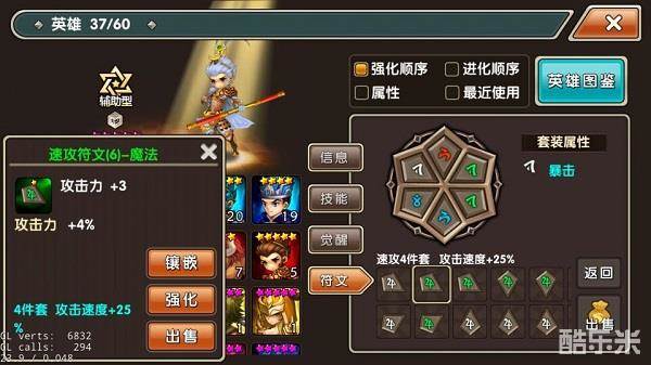 打开英雄面板之后会发现有一个符文面板,一个英雄拥有六个符文槽,每一个符文槽上面有一个数字,而在符文上也有对应的符文数字。将符文镶嵌在相应的位置上,英雄就获得了符文上面的属性,并且符文还可以通过强化提高属性,这样英雄的