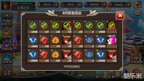 每天第一次登陆游戏的时候会有一个签到表,你可以看到上面有很多的奖品,除了魔石、魔钻还有天使怪、英雄碎片、召唤珠。魔石与魔钻随着签到天数的累积数额会不断增大,第一天有签到2000魔石第十五天就有10000魔石了。这个奖励非常容易得到,只要每天登陆奖励就会直接发放到你的邮箱了。这个活动每个月会重置一次,所以要记得每天签到哦,不然后面的丰厚大奖就得不到了。