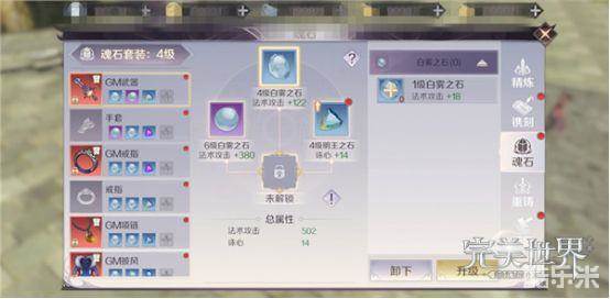 其中白雾之石作为增加法术攻击的魂石数量一定是最多的,而其他的魂石大家可以选择暴击流派和穿透流派,前者镶嵌明王之石和溢水之石,提升人物的诛心和法术暴击,后者镶嵌锐利之石和伏羲之石,提升人物的命中和法术穿透属性。