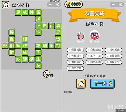 《成语升官记》举人第145关的成语不是什么冷门的成语,但是缺头少尾的集中在一起还是有一点的难度的,下面就是小编为大家整理的第145关答案,希望可以帮助到各位!