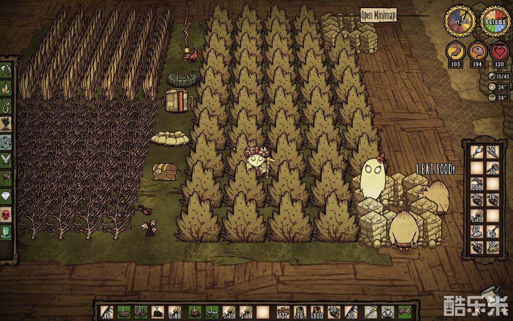 首先是主基地附近,对于想要过农场生活的我来说这图简直棒鸡辣!守着猪王不缺金子,守着牛哥前期各种便利,牛哥下面还是一大片兔子场,前期的肉真是吃不完的吃,当然到了后期挺麻烦,我最初接触饥荒是小伙伴拉我入联机坑,联机里面兔子几天不收还是很新鲜,单机三四天不收兔子就变红了。基本上如果家里肉够的话这里就是最没效率的腐烂物生产场==另外如果你要问为什么下面的桦木林这么稀疏的话,答案很显然了==让熊大啃的我前期的木材、金矿还有各种灌木丛树枝都是左边的那片混合地形提供的,有了铃铛以后还作死清掉了高脚鸟,话说大脚踩不掉鸟窝真是太良心了。顺便一提,我赶脚饥荒里面最缺的绝壁是石头!!建第一个家挥霍了不少,第二个家收敛了一些,到了第三个家真是能不用石头就不用石头