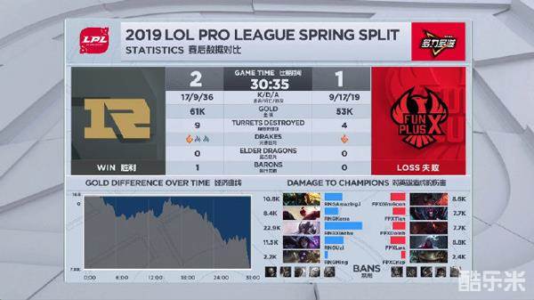比赛的前期,RNG中野发挥优势将FPX中野均是压制住,RNG快速的拿到前期的领先,虽然FPX之后快速的变节奏,帮助己方上路剑魔拿到了领先,但无奈整体落后过大,RNG前期领先巨大。