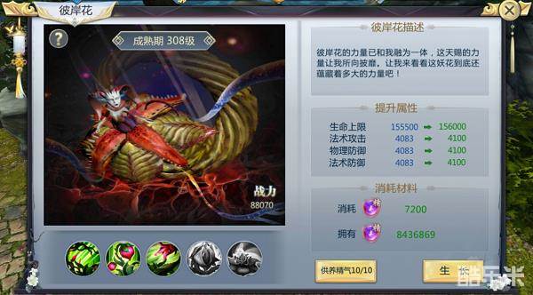 彼岸花是后期增加属性的重要途径,而且可以消耗经验值来提供精气,也是消耗多余经验值的一个途径。并且彼岸花的图像会随着等级的提升而变化,最终将变成一个你意想不到的形象哦。