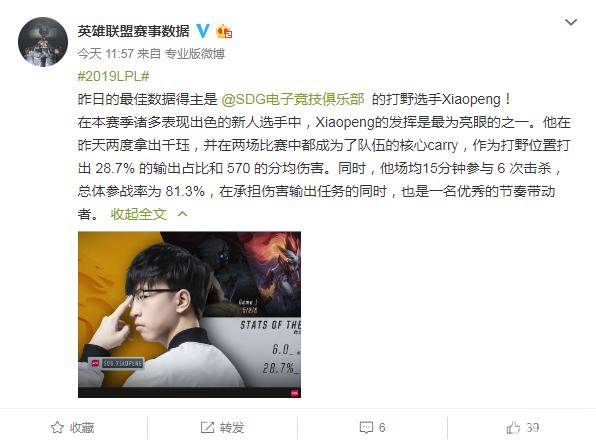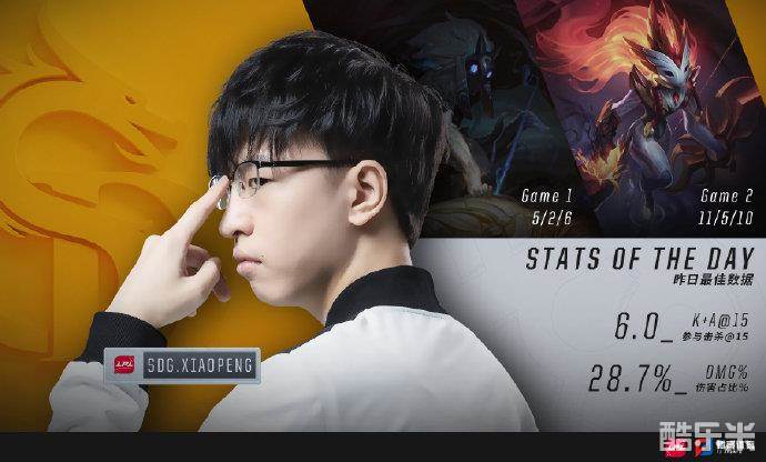 3月5日LPL以SDG 2:0战胜OMG、SN绝境翻盘让一追二击败LGD落幕,其中SDG打野选手Xiaopeng两场比赛都成为队伍的核心Carry,以28.7%的输出占比和570的分均伤害,获选当日最佳数据选手。
