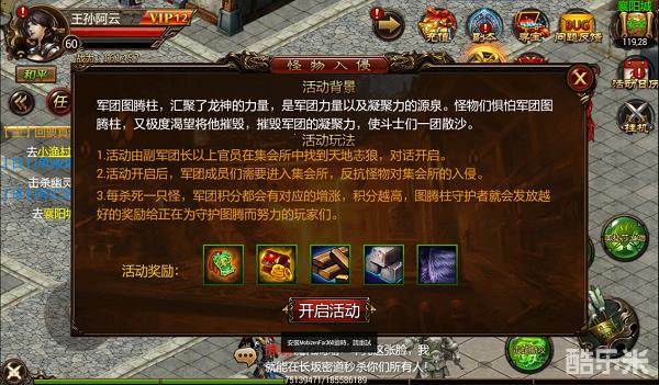 2.军团长和副军团长,可以通过消耗军团资金来开启怪物入侵活动(军团资金不足,可以使用元宝开启)。每天只能开启1次。